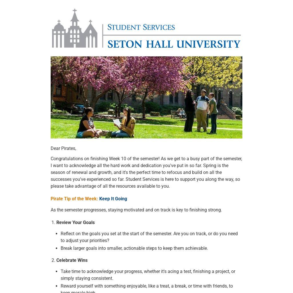 Congratulations on finishing Week 10 of the semester! As we get to a busy part of the semester, I want to acknowledge all the hard work and dedication you've put in so far. Spring is the season of renewal and growth, and it's the perfect time to refocus and build on all the successes you've experienced so far. Student Services is here to support you along the way, so please take advantage of all the resources available to you.