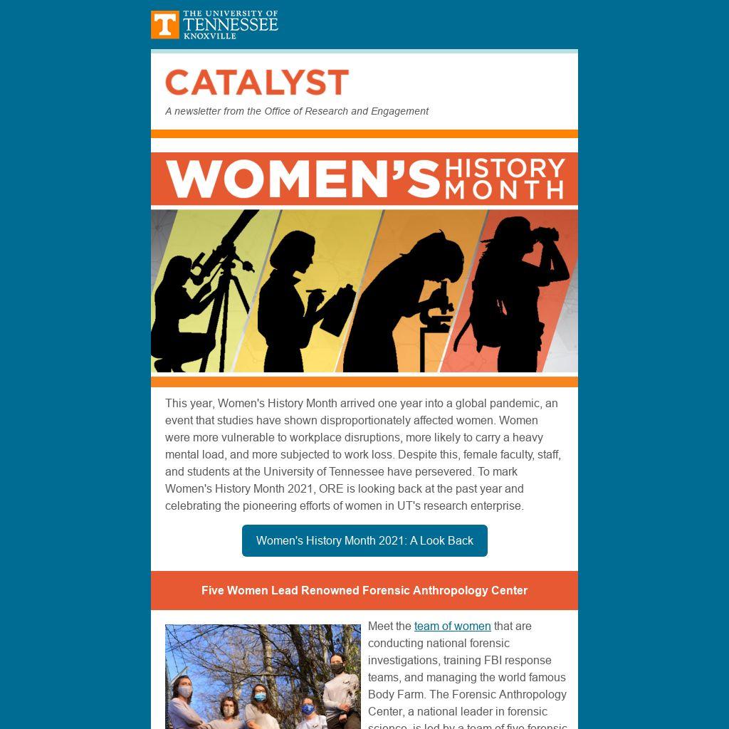This year, Women's History Month arrived one year into a global pandemic, an event that studies have shown disproportionately affected women. Women were more vulnerable to workplace disruptions, more likely to carry a heavy mental load, and more subjected to work loss. Despite this, female faculty, staff, and students at the University of Tennessee have persevered. To mark Women's History Month 2021, ORE is looking back at the past year and celebrating the pioneering efforts of women in UT's research enterprise.