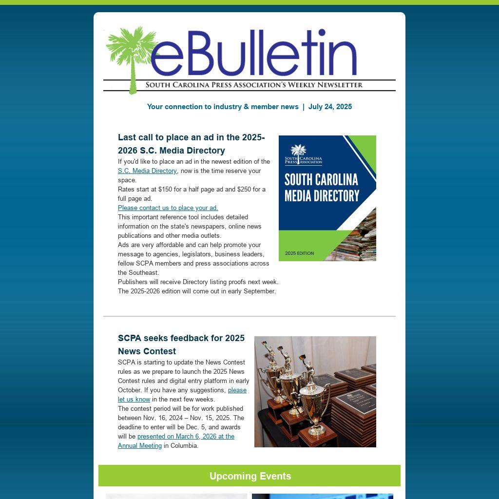 Last call to place an ad in the 2025-2026 S.C. Media Directory If you'd like to place an ad in the newest edition of the S.C. Media Directory, now is the time reserve your space.