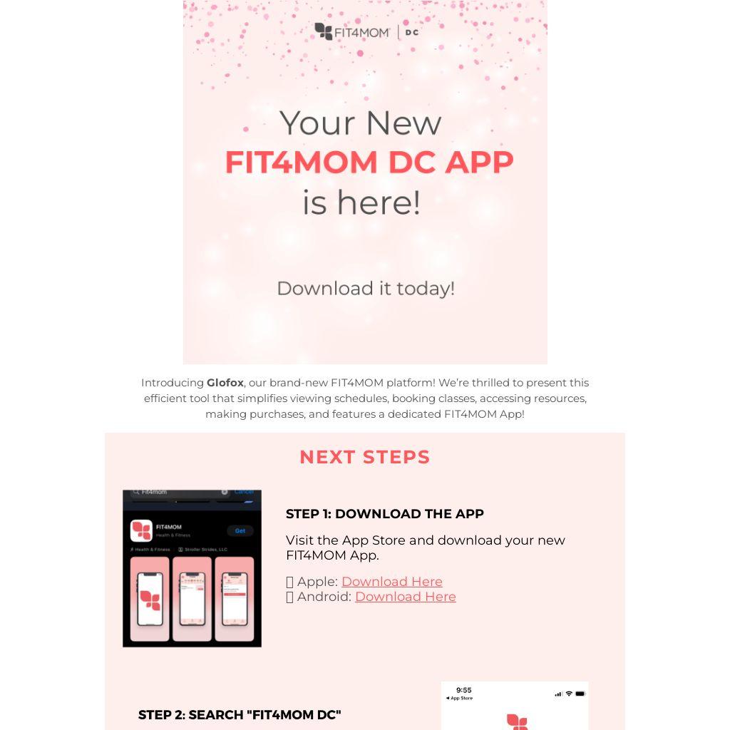Introducing Glofox, our brand-new FIT4MOM platform! We’re thrilled to present this efficient tool that simplifies viewing schedules, booking classes, accessing resources, making purchases, and features a dedicated FIT4MOM App!