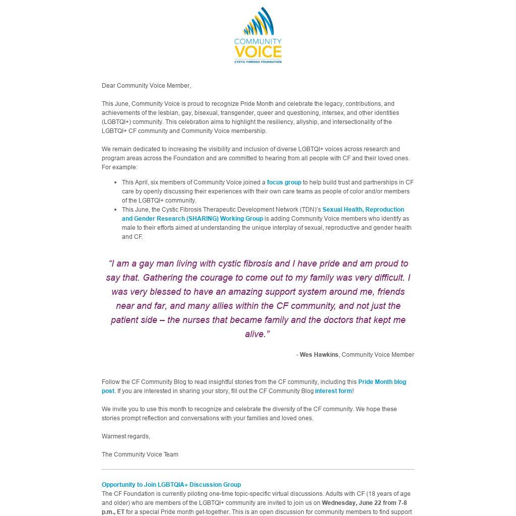 We remain dedicated to increasing the visibility and inclusion of diverse LGBTQI+ voices across research and program areas across the Foundation and are committed to hearing from all people with CF and their loved ones. For example: