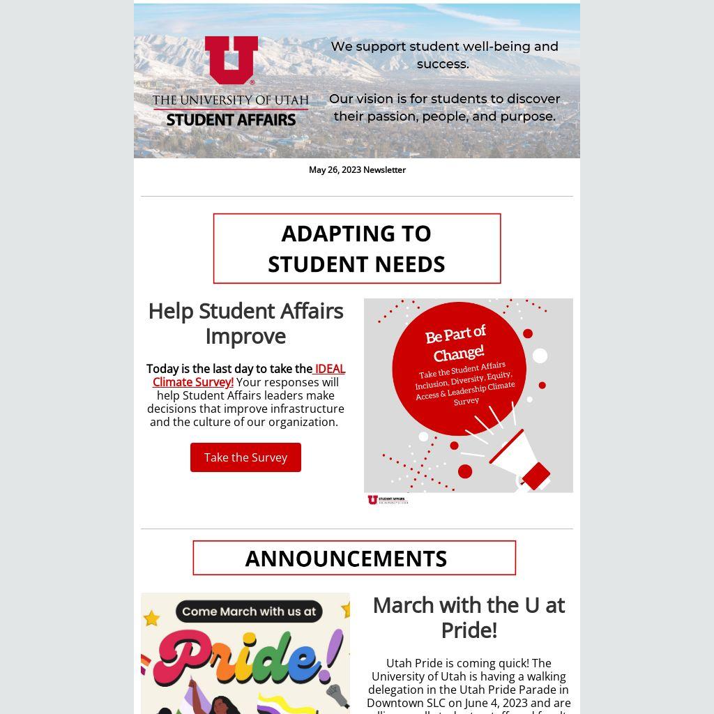 Today is the last day to take the IDEAL Climate Survey! Your responses will help Student Affairs leaders make decisions that improve infrastructure and the culture of our organization.