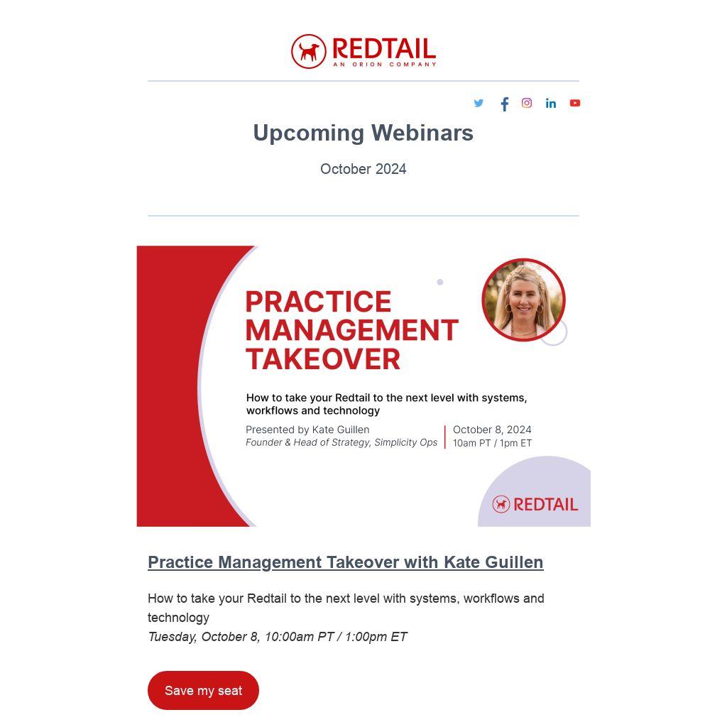 Our live webinars will be hosted by a Redtail Trainer to guide you through the topic and address any questions that may arise. Bookmark our Upcoming Webinars page or follow us on social media to stay up-to-date on our webinars.