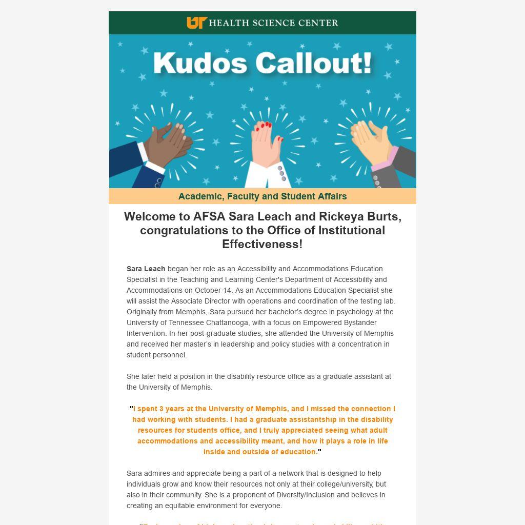 Please extend a warm welcome to Sara Leach and Rickeya Burts, and send your congratulations to the Office of Institutional Effectiveness!