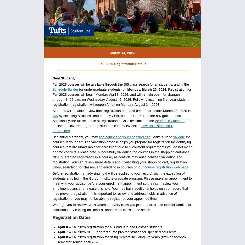 Fall 2026 courses will be available through the SIS class search for all students, and in the Schedule Builder for undergraduate students, on Monday, March 23, 2026. Registration for Fall 2026 courses will begin Monday, April 6, 2026, and will remain open for changes through 11:59 p.m. on Wednesday, August 19, 2026. Following incoming first-year student registration, registration will reopen for all on Monday, August 31, 2026.