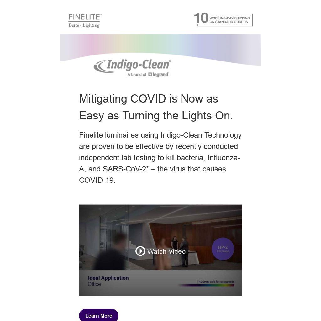Finelite luminaires using Indigo-Clean Technology are proven to be effective by recently conducted independent lab testing to kill bacteria, Influenza-A, and SARS-CoV-2* – the virus that causes COVID-19.