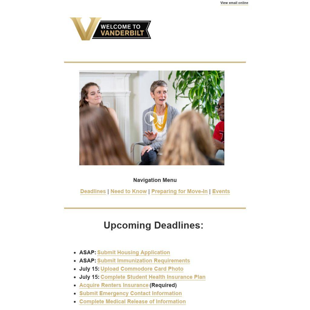 Summer Webinars: Throughout the summer, join us for a series of webinars to learn more about your Vanderbilt experience. The webinars can be accessed via the Residential Colleges website. The webinar will be recorded and the recording will be posted to the same site within one week.