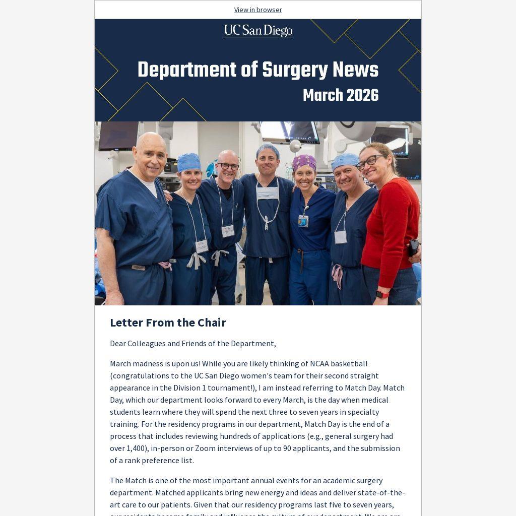 March madness is upon us! While you are likely thinking of NCAA basketball (congratulations to the UC San Diego women's team for their second straight appearance in the Division 1 tournament!), I am instead referring to Match Day. Match Day, which our department looks forward to every March, is the day when medical students learn where they will spend the next three to seven years in specialty training. For the residency programs in our department, Match Day is the end of a process that includes reviewing hundreds of applications (e.g., general surgery had over 1,400), in-person or Zoom interviews of up to 90 applicants, and the submission of a rank preference list.