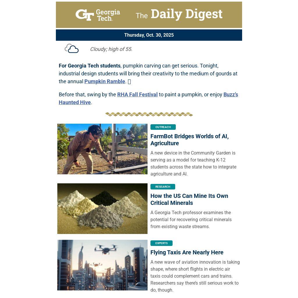 For Georgia Tech students, pumpkin carving can get serious. Tonight, industrial design students will bring their creativity to the medium of gourds at the annual Pumpkin Ramble. 🎃
