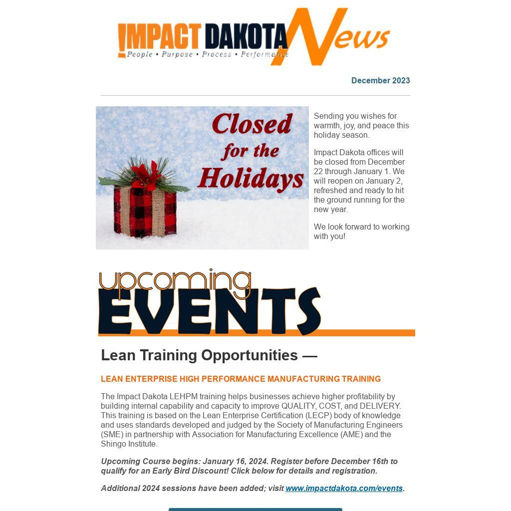 Impact Dakota offices will be closed from December 22 through January 1. We will reopen on January 2, refreshed and ready to hit the ground running for the new year.