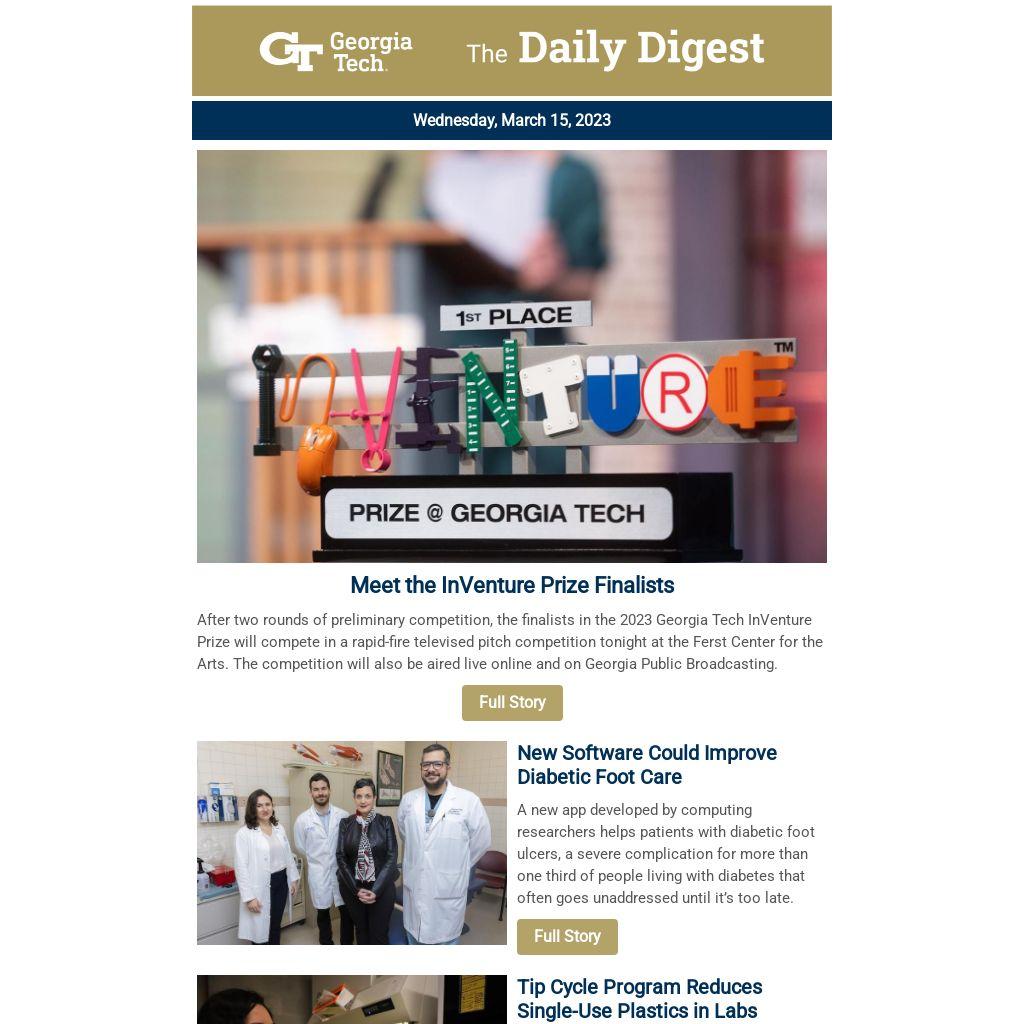 After two rounds of preliminary competition, the finalists in the 2023 Georgia Tech InVenture Prize will compete in a rapid-fire televised pitch competition tonight at the Ferst Center for the Arts. The competition will also be aired live online and on Georgia Public Broadcasting.