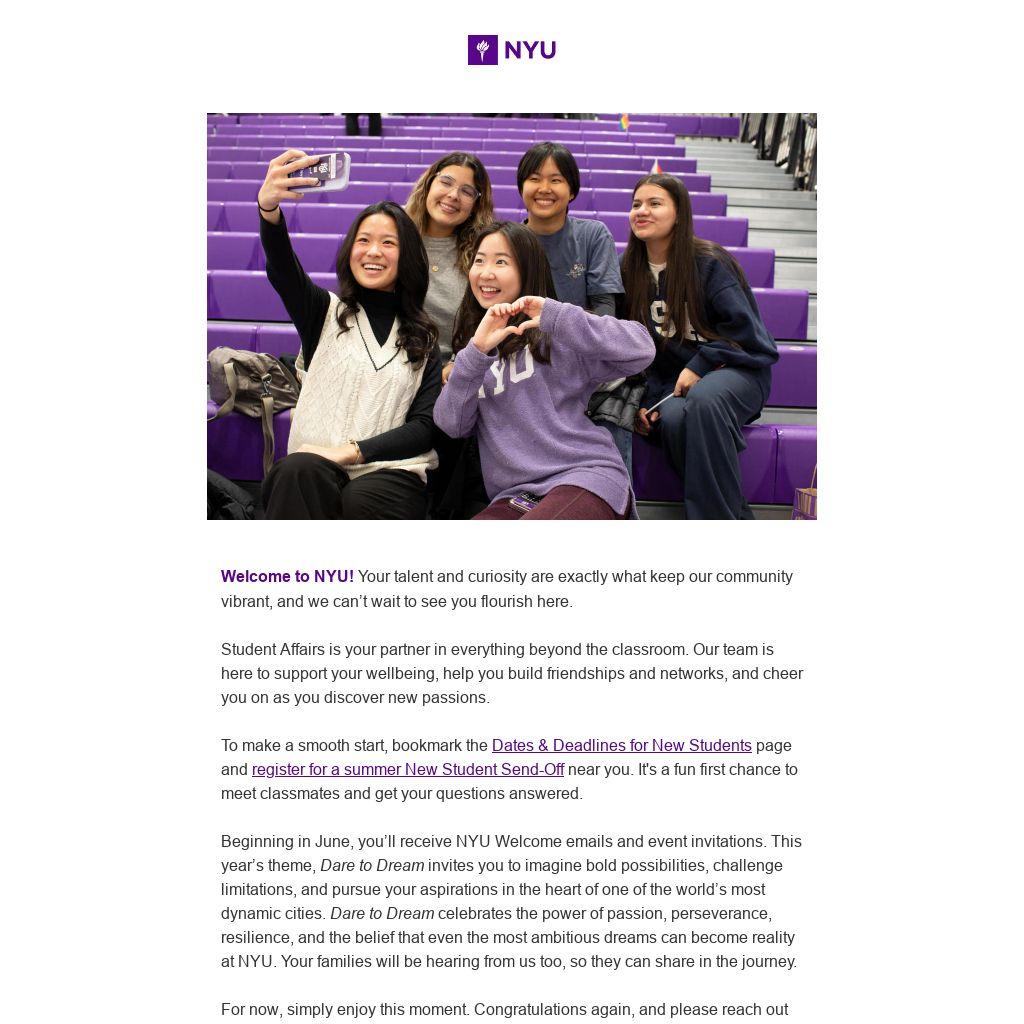 Beginning in June, you’ll receive NYU Welcome emails and event invitations. This year’s theme,