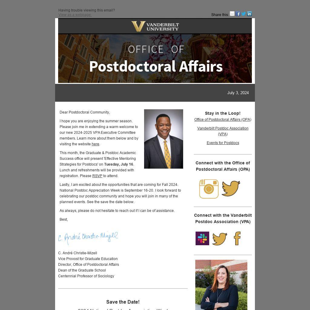 Vanderbilt University Office of Postdoctoral Affairs  |  615.343.1990