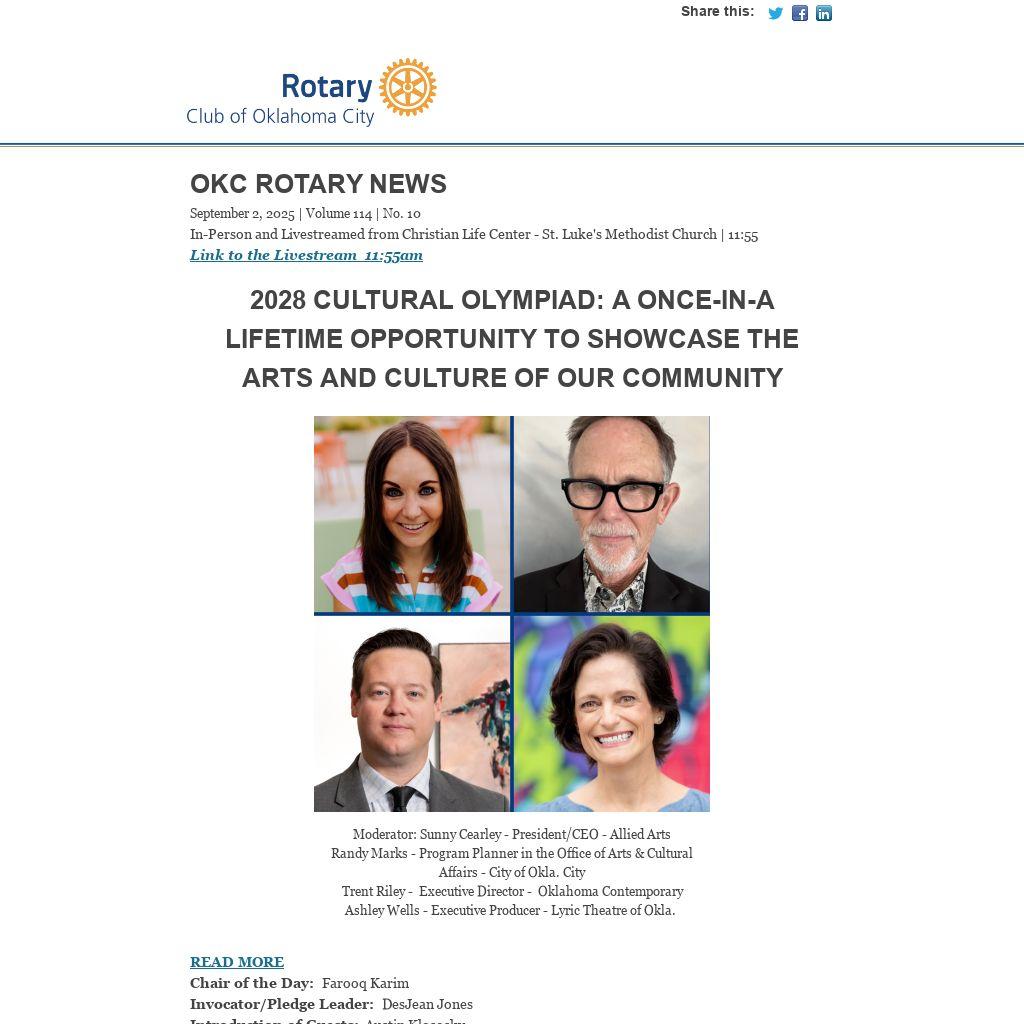 READ MORE Chair of the Day: Farooq Karim Invocator/Pledge Leader: DesJean Jones Introduction of Guests: Austin Klososky Greeters/ Scanners: Mandy Heaps, Ellyn Hefner New Rotarian Welcome Table: Nancy Hyde Q&A/Microphone: Bobby Mills, Bart Binning Registration: Emily Taylor, Kathy Frankenfield Menu: Mixed Green Salad; Cole Slaw; Cheddar Biscuits; Mashed Potato; Roasted Corn: BBQ Pork Ribs; Fried Chicken
