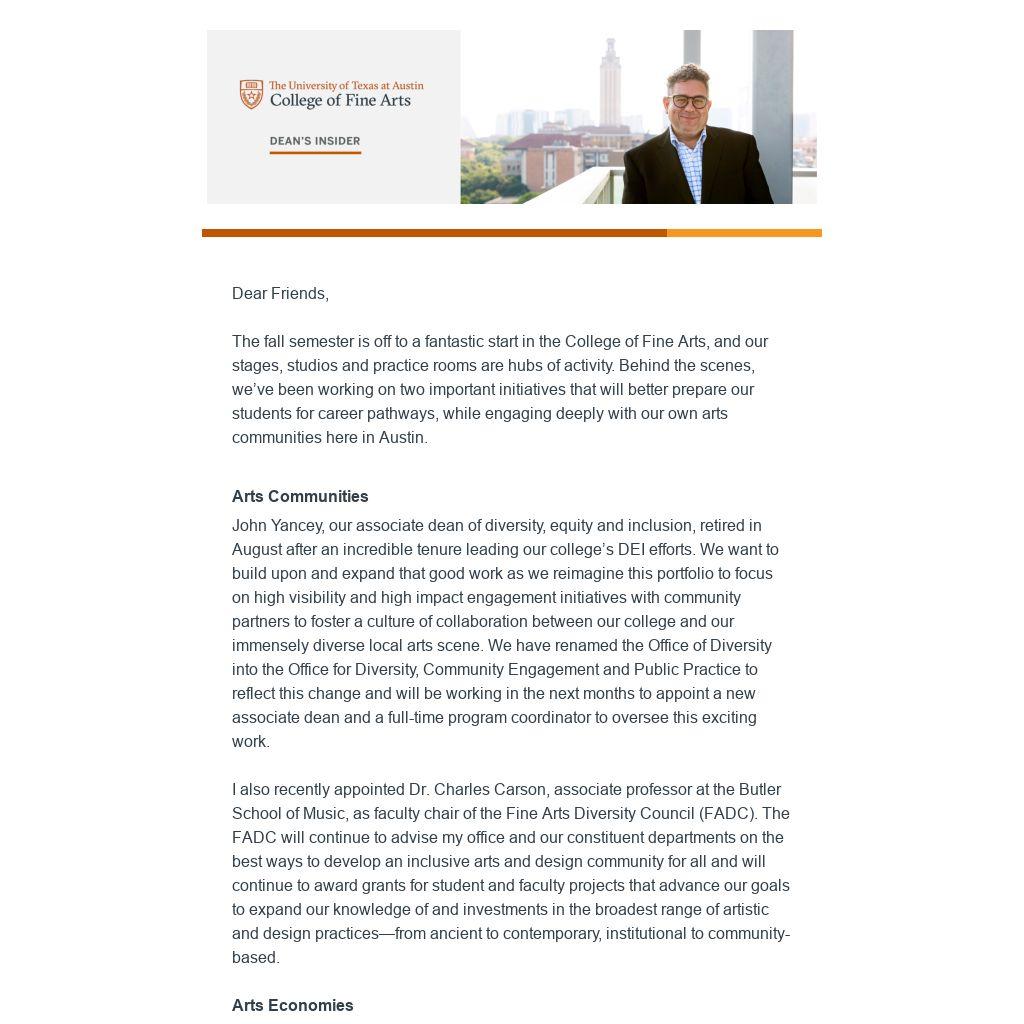 I also recently appointed Dr. Charles Carson, associate professor at the Butler School of Music, as faculty chair of the Fine Arts Diversity Council (FADC). The FADC will continue to advise my office and our constituent departments on the best ways to develop an inclusive arts and design community for all and will continue to award grants for student and faculty projects that advance our goals to expand our knowledge of and investments in the broadest range of artistic and design practices—from ancient to contemporary, institutional to community-based.