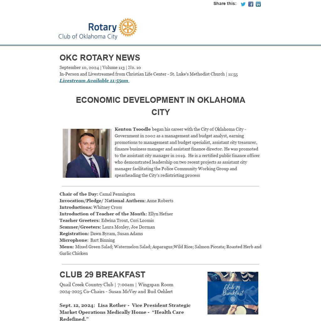 OKC ROTARY NEWSSeptember 10, 2024 | Volume 113 | No. 10 In-Person and Livestreamed from Christian Life Center - St. Luke's Methodist Church | 11:55