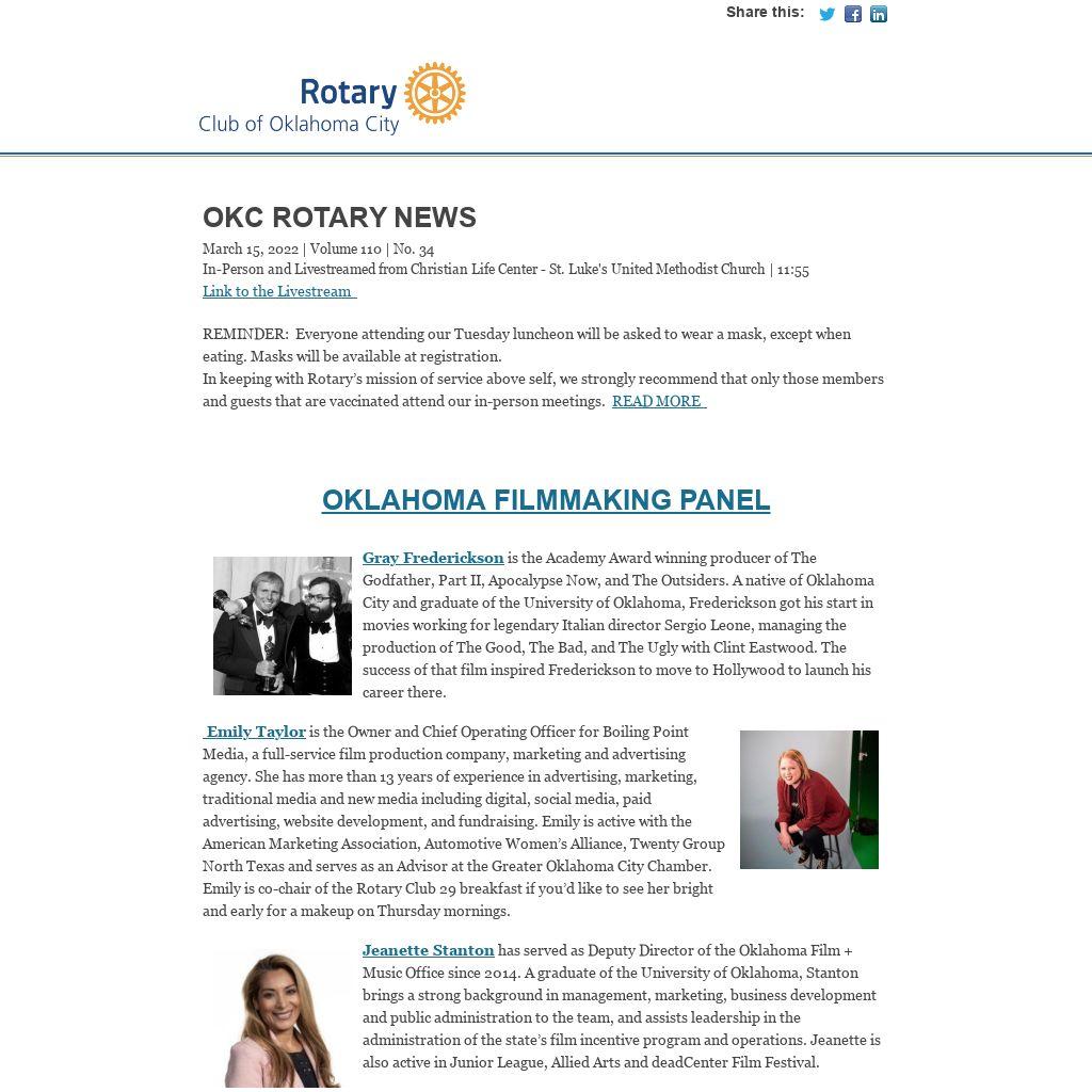Rotary Club 29 has an online membership directory which contains current content information for all club members. The link to access the Club 29 directory can be found at the top of the home page of okcrotary.club or by clicking here. OKC Rotary has provided this tool as a convenience to help members stay in touch with one another. The online directory, just like the printed roster, should only be used for Rotary purposes. If you need help in accessing the directory, please email the office.