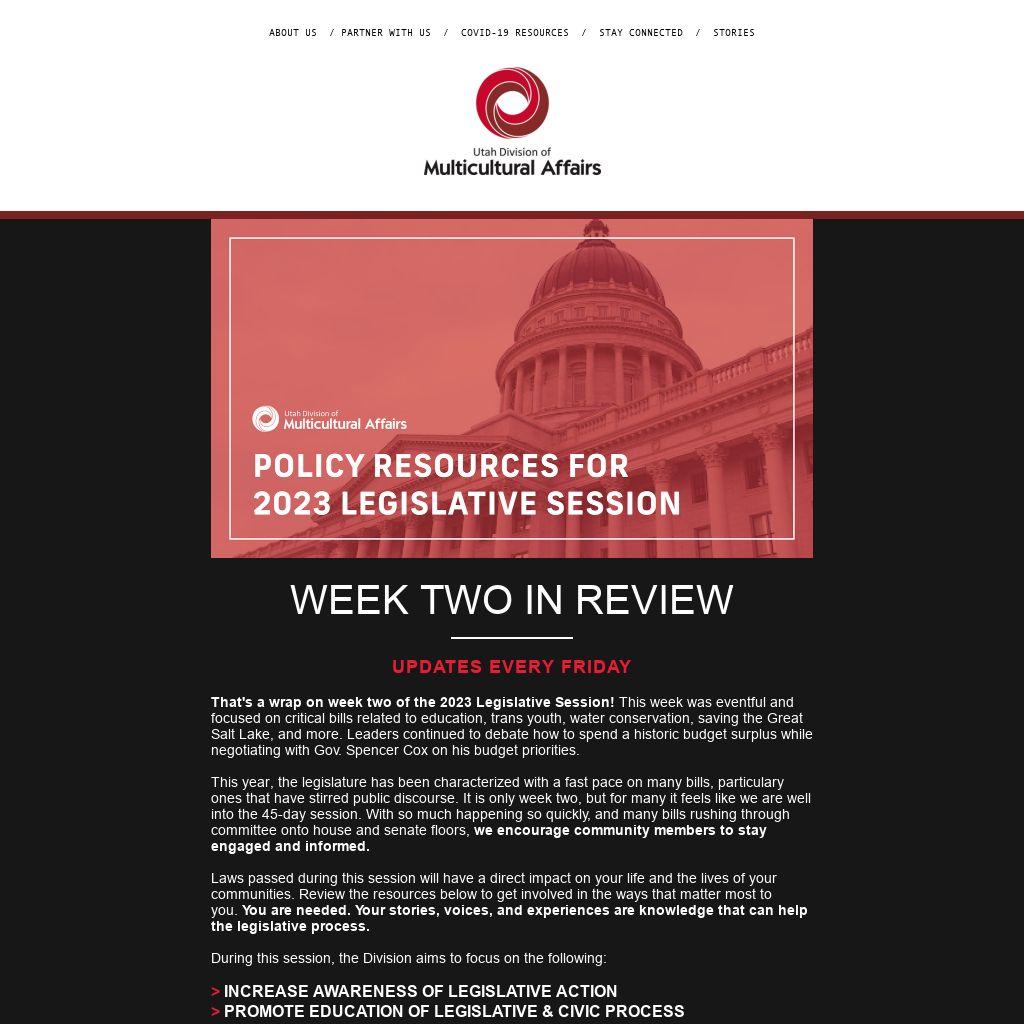 The information does not necessarily reflect the views or opinions of the Utah Department of Cultural and Community Engagement (CCE), Utah Division of Multicultural Affairs, or divisions associated with CCE. The intent of these resources are to provide information regarding the legislative session to help communities become informed.