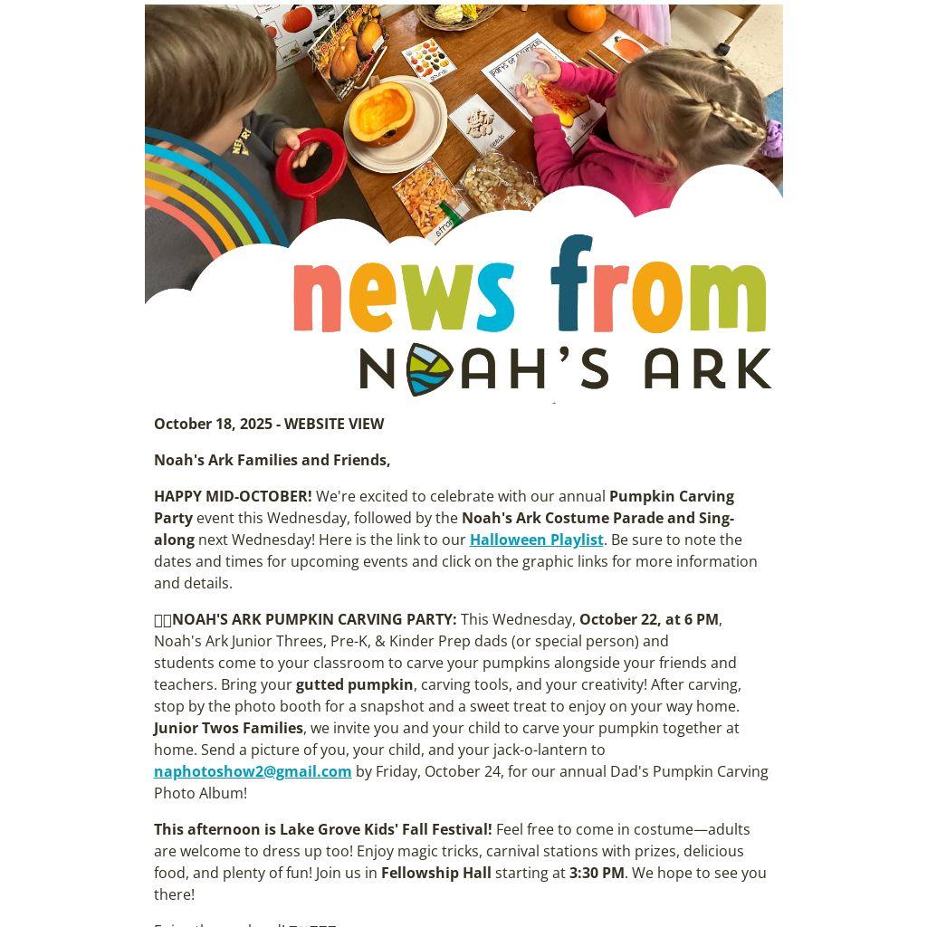 🎃🎃NOAH'S ARK PUMPKIN CARVING PARTY: This Wednesday, October 22, at 6 PM, Noah's Ark Junior Threes, Pre-K, & Kinder Prep dads (or special person) and students come to your classroom to carve your pumpkins alongside your friends and teachers. Bring your gutted pumpkin, carving tools, and your creativity! After carving, stop by the photo booth for a snapshot and a sweet treat to enjoy on your way home.