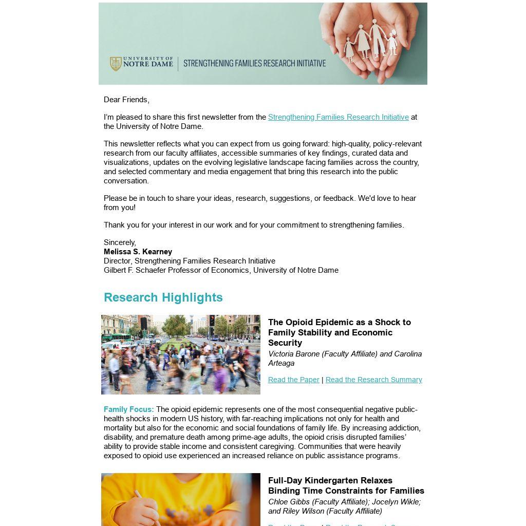 I’m pleased to share this first newsletter from the Strengthening Families Research Initiative at the University of Notre Dame.