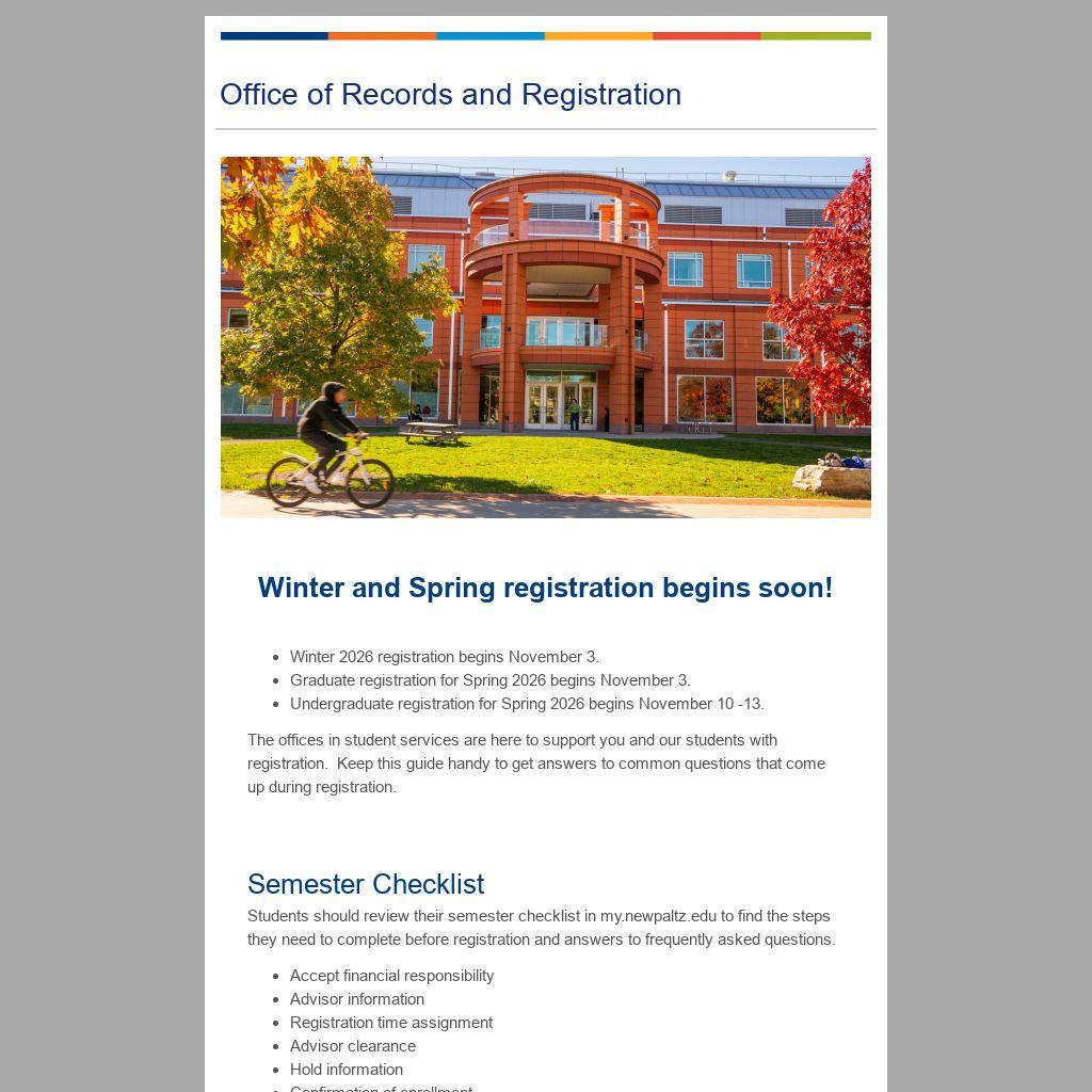 Students should review their semester checklist in my.newpaltz.edu to find the steps they need to complete before registration and answers to frequently asked questions.
