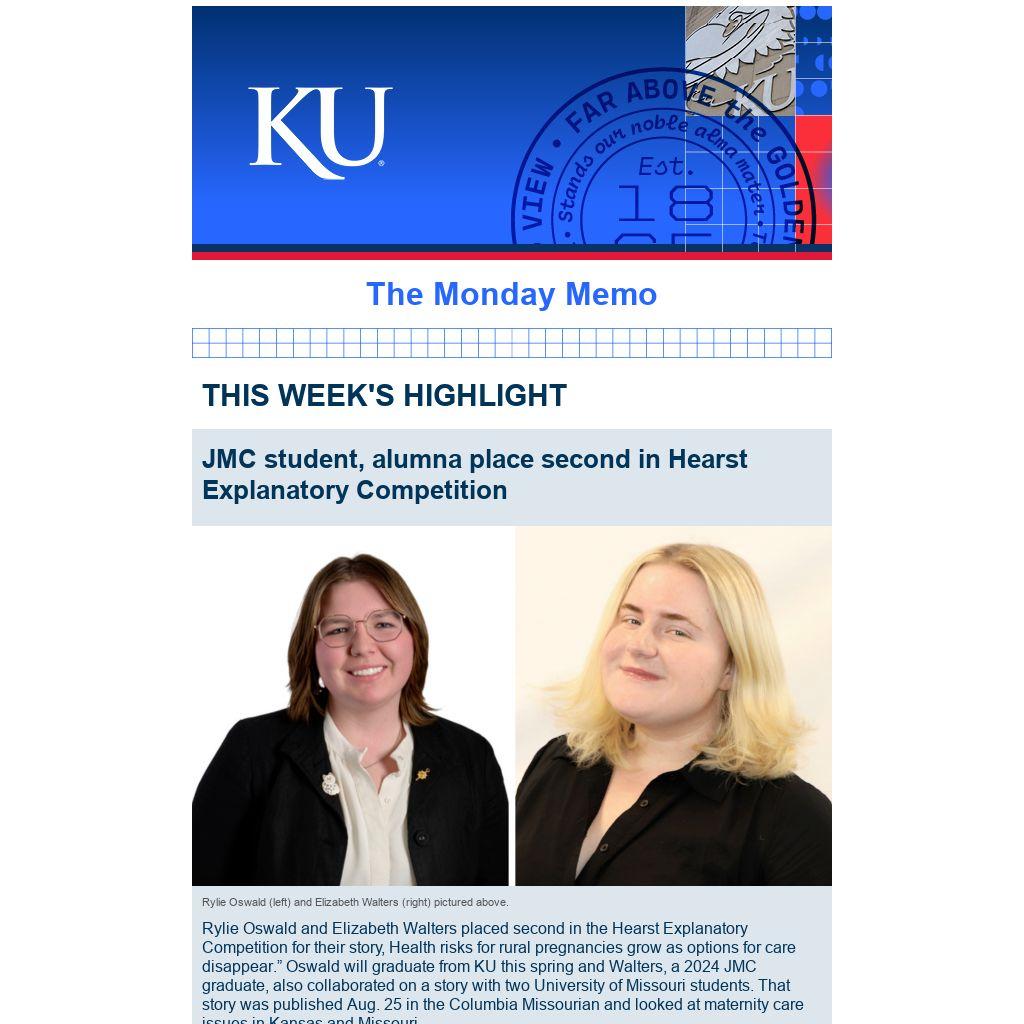 Rylie Oswald and Elizabeth Walters placed second in the Hearst Explanatory Competition for their story, Health risks for rural pregnancies grow as options for care disappear.” Oswald will graduate from KU this spring and Walters, a 2024 JMC graduate, also collaborated on a story with two University of Missouri students. That story was published Aug. 25 in the Columbia Missourian and looked at maternity care issues in Kansas and Missouri.