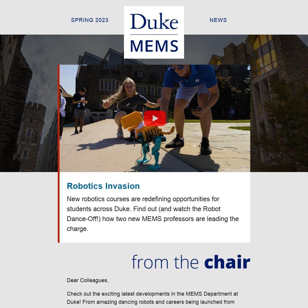 Check out the exciting latest developments in the MEMS Department at Duke! From amazing dancing robots and careers being launched from our makerspaces to faculty awards and the innovative "smart homes" senior design project, it's been quite a busy semester. You'll get a glimpse of new sound-based technology for sorting biological nanoparticles, and we've also compiled a few captivating highlights, complete with video clips, for your viewing pleasure. Have an amazing summer and congratulations to all Duke MEMS graduates launching their careers this May!