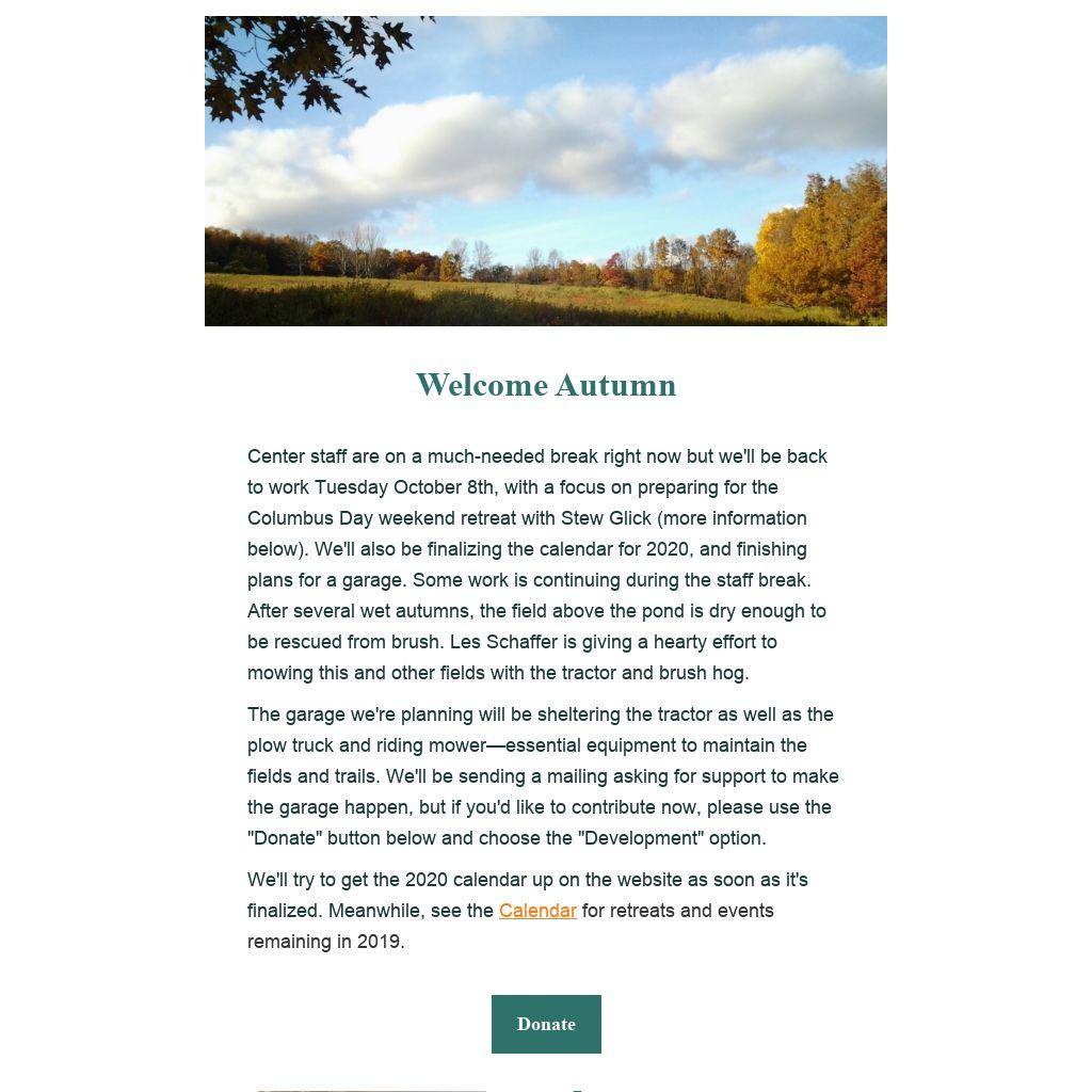 Center staff are on a much-needed break right now but we'll be back to work Tuesday October 8th, with a focus on preparing for the Columbus Day weekend retreat with Stew Glick (more information below). We'll also be finalizing the calendar for 2020, and finishing plans for a garage. Some work is continuing during the staff break. After several wet autumns, the field above the pond is dry enough to be rescued from brush. Les Schaffer is giving a hearty effort to mowing this and other fields with the tractor and brush hog.