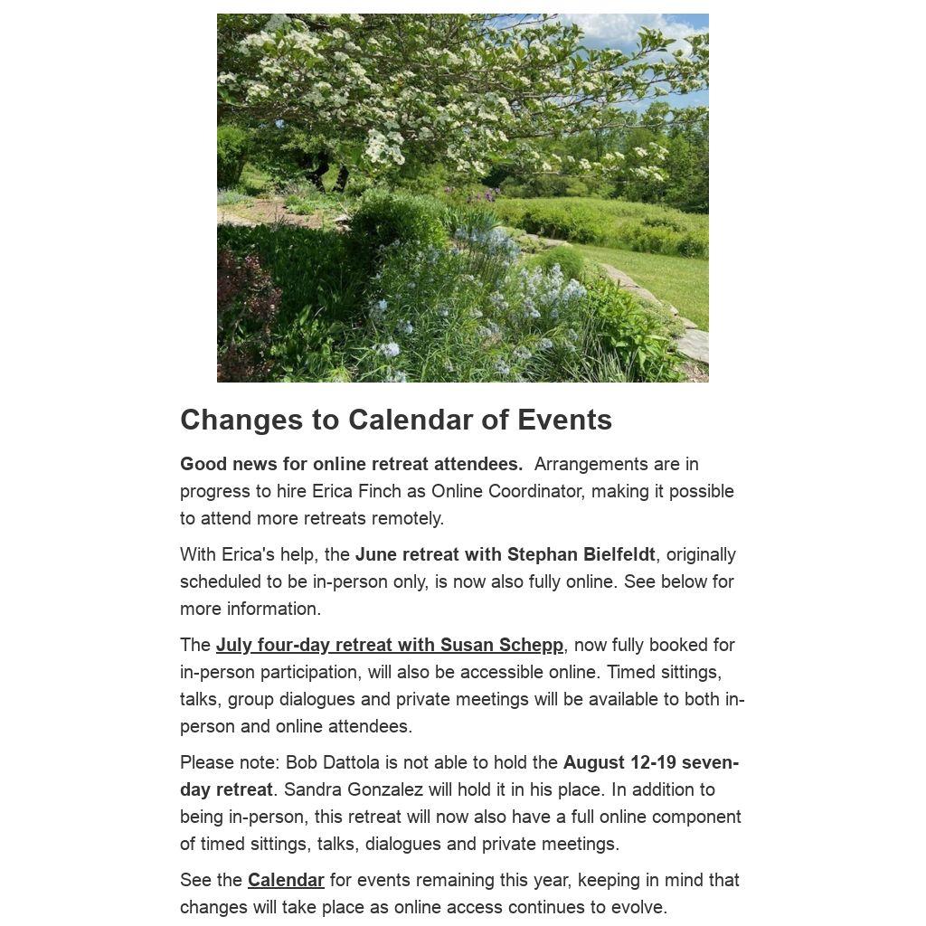 Also, please note the change to Stephan's retreat: it will now be fully available online, with timed sittings, daily talks, opportunities for private meetings and daily online group dialogues.