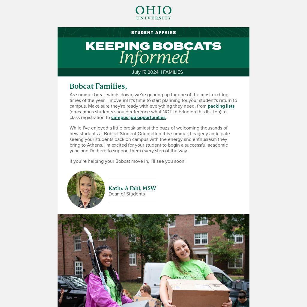 While I've enjoyed a little break amidst the buzz of welcoming thousands of new students at Bobcat Student Orientation this summer, I eagerly anticipate seeing your students back on campus with the energy and enthusiasm they bring to Athens. I'm excited for your student to begin a successful academic year, and I'm here to support them every step of the way.
