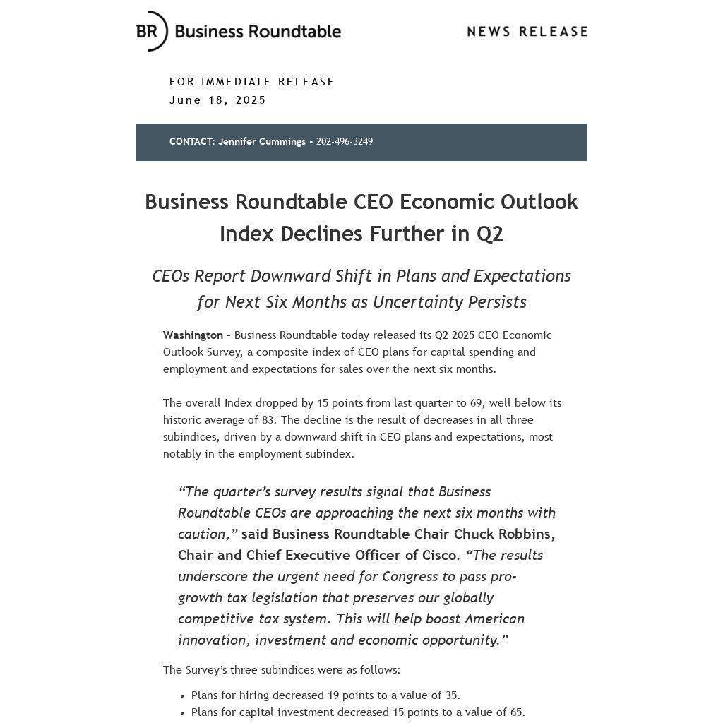 “Driving this quarter’s decline in the Index is broad-based uncertainty, arising substantially from an unpredictable trade policy environment,” said Business Roundtable CEO Joshua Bolten. “Extending and enhancing tax reform is critical, but it is not sufficient. American businesses also need the Administration rapidly to secure deals with our trading partners that open markets, remove harmful tariffs and provide certainty for investment.”