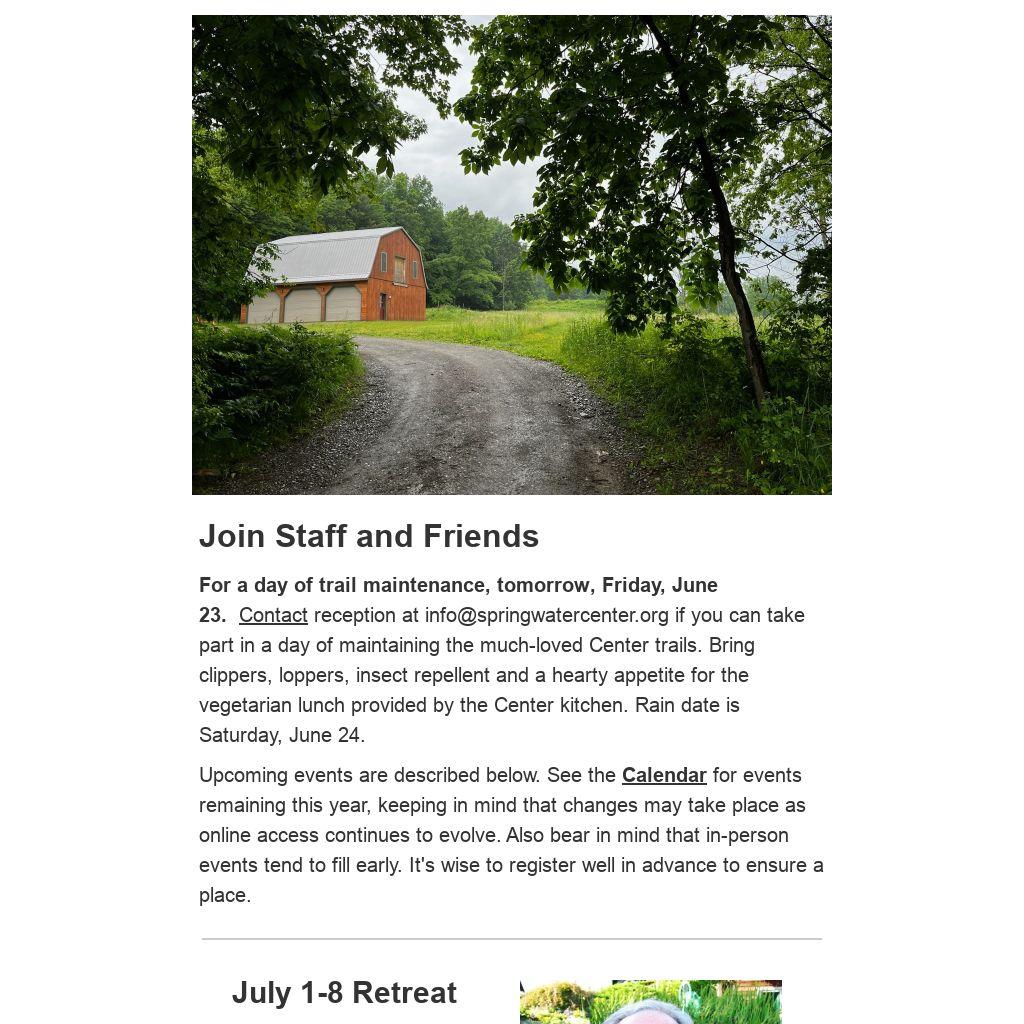 For a day of trail maintenance, tomorrow, Friday, June 23.  Contact reception at info@springwatercenter.org if you can take part in a day of maintaining the much-loved Center trails. Bring clippers, loppers, insect repellent and a hearty appetite for the vegetarian lunch provided by the Center kitchen. Rain date is Saturday, June 24.