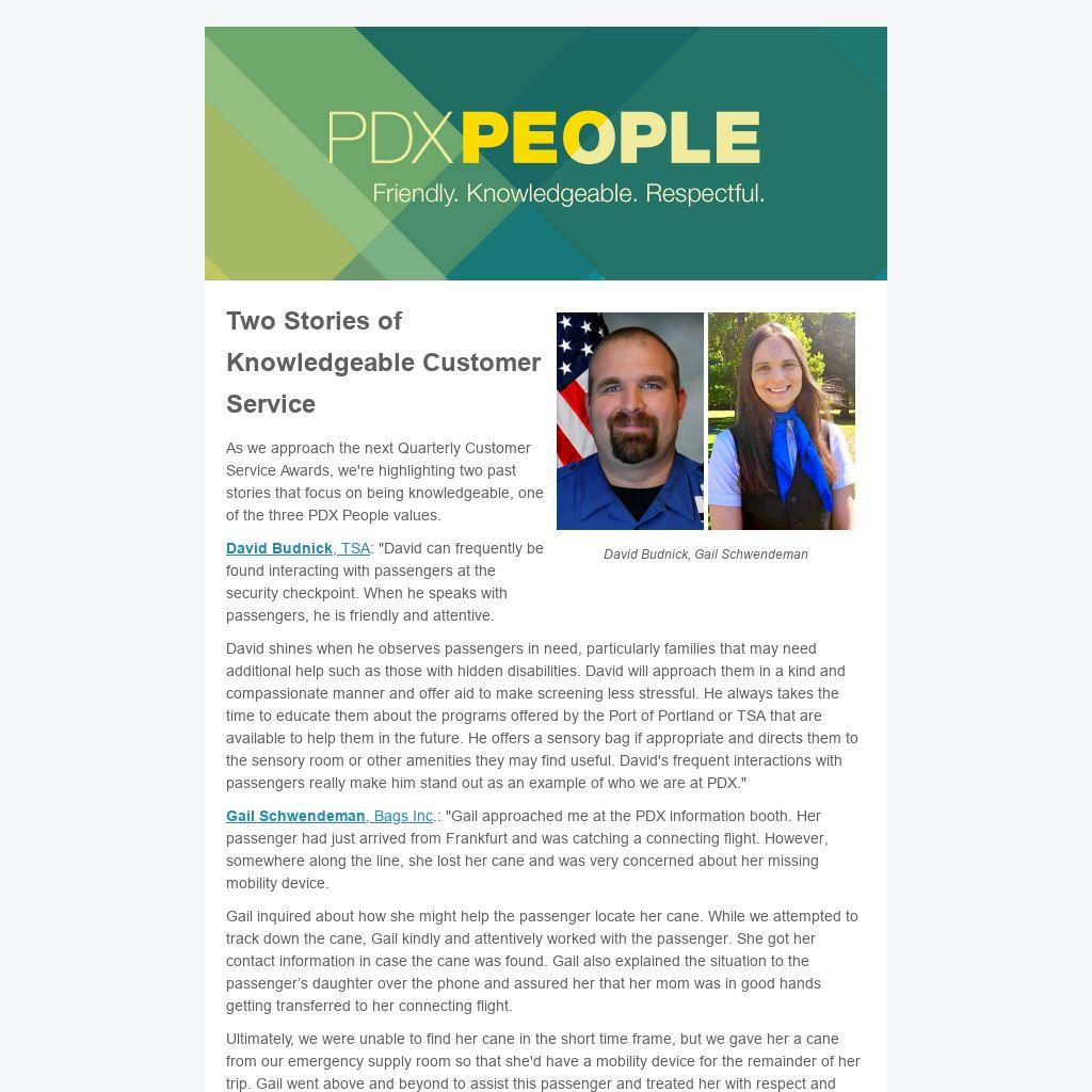 As we approach the next Quarterly Customer Service Awards, we're highlighting two past stories that focus on being knowledgeable, one of the three PDX People values.