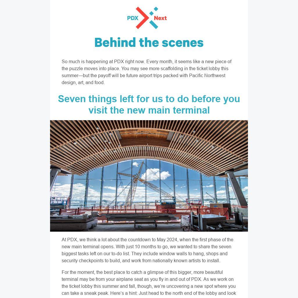 At PDX, we think a lot about the countdown to May 2024, when the first phase of the new main terminal opens. With just 10 months to go, we wanted to share the seven biggest tasks left on our to-do list. They include window walls to hang, shops and security checkpoints to build, and work from nationally known artists to install.