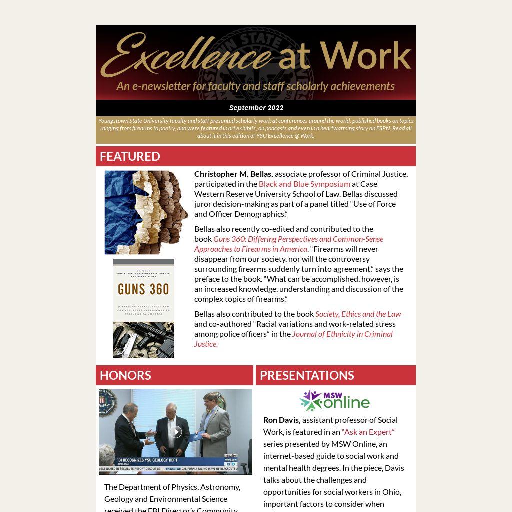Youngstown State University faculty and staff presented scholarly work at conferences around the world, published books on topics ranging from firearms to poetry, and were featured in art exhibits, on podcasts and even in a heartwarming story on ESPN. Read all about it in this edition of YSU Excellence @ Work.