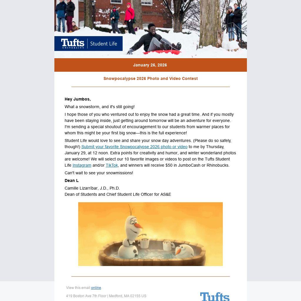 Student Life would love to see and share your snow day adventures. (Please do so safely, though!) Submit your favorite Snowpocalypse 2026 photo or video to me by Thursday, January 29, at 12 noon. Extra points for creativity and humor, and winter wonderland photos are welcome! We will select our 10 favorite images or videos to post on the Tufts Student Life Instagram and/or TikTok, and winners will receive $50 in JumboCash or Rhinobucks.
