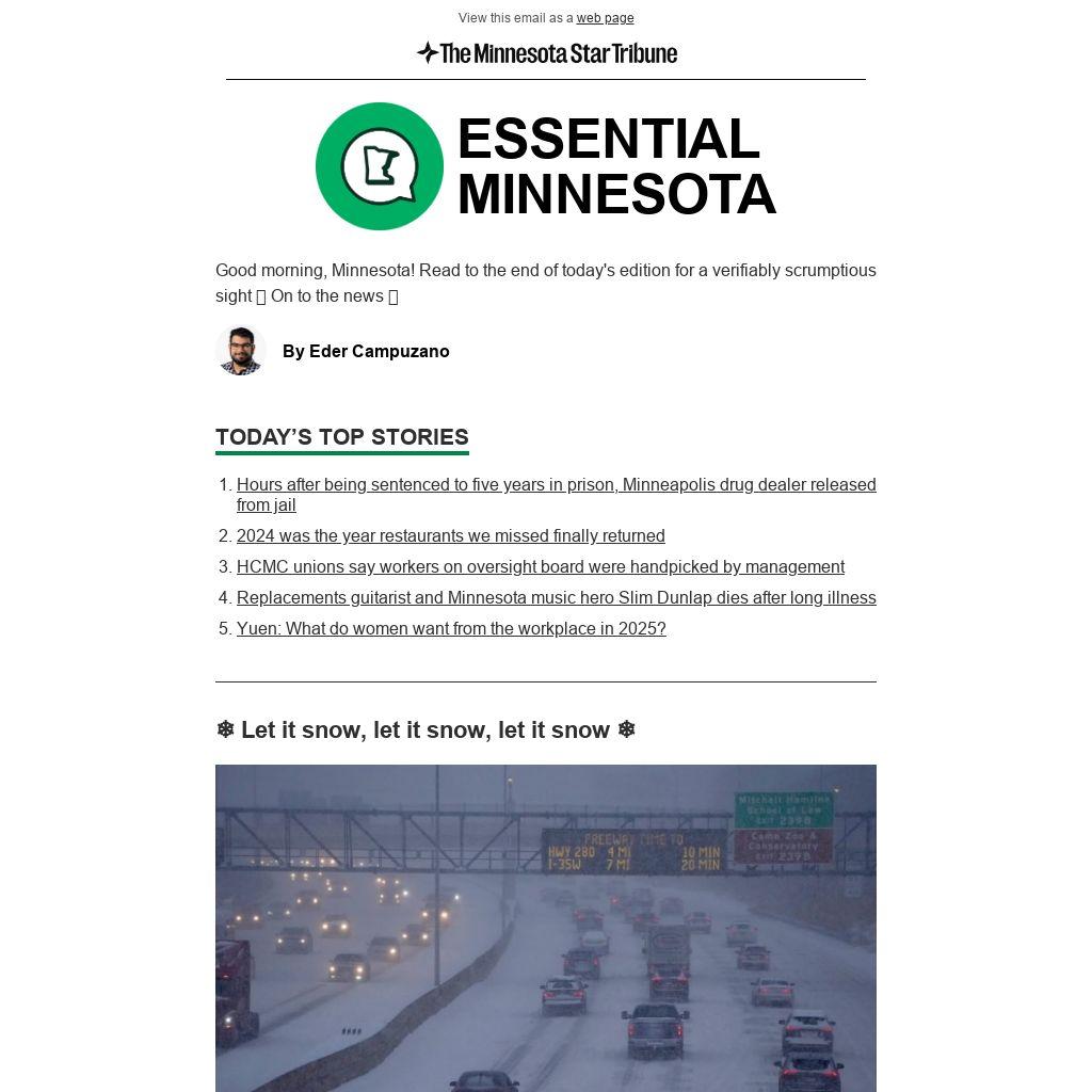 Essential Minnesota readers probably don't need to hear this, but NWS is also advising commuters to watch out for slick roads on the way in to work today — and likely on the way home. (Your friendly neighborhood newsletter writer is personally avoiding Lake Street as much as possible for the next week.)