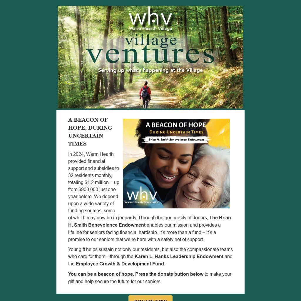 In 2024, Warm Hearth provided financial support and subsidies to 32 residents monthly, totaling $1.2 million -- up from $900,000 just one year before. We depend upon a wide variety of funding sources, some of which may now be in jeopardy. Through the generosity of donors, The Brian H. Smith Benevolence Endowment enables our mission and provides a lifeline for seniors facing financial hardship. It’s more than a fund – it’s a promise to our seniors that we’re here with a safety net of support.