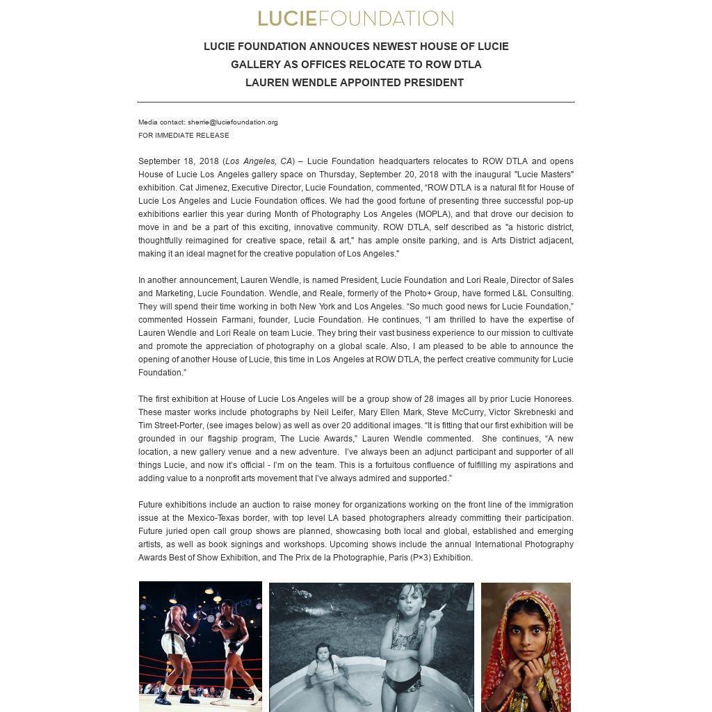 September 18, 2018 (Los Angeles, CA) – Lucie Foundation headquarters relocates to ROW DTLA and opens House of Lucie Los Angeles gallery space on Thursday, September 20, 2018 with the inaugural "Lucie Masters" exhibition. Cat Jimenez, Executive Director, Lucie Foundation, commented, “ROW DTLA is a natural fit for House of Lucie Los Angeles and Lucie Foundation offices. We had the good fortune of presenting three successful pop-up exhibitions earlier this year during Month of Photography Los Angeles (MOPLA), and that drove our decision to move in and be a part of this exciting, innovative community. ROW DTLA, self described as "a historic district, thoughtfully reimagined for creative space, retail & art," has ample onsite parking, and is Arts District adjacent, making it an ideal magnet for the creative population of Los Angeles."