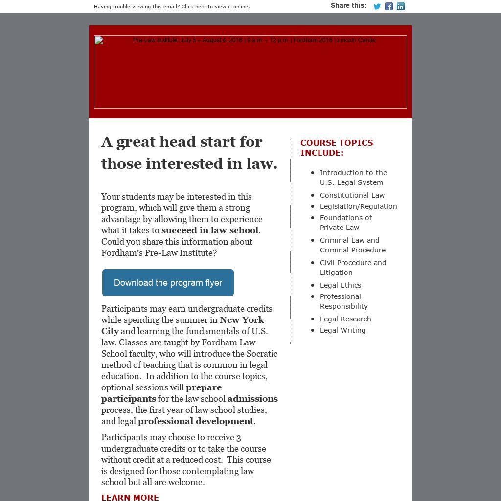 Your students may be interested in this program, which will give them a strong advantage by allowing them to experience what it takes to succeed in law school. Could you share this information about Fordham’s Pre-Law Institute?