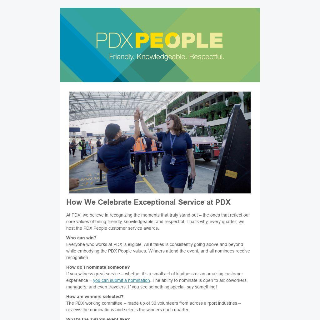 The PDX working committee – made up of 30 volunteers from across airport industries – reviews the nominations and selects the winners each quarter.