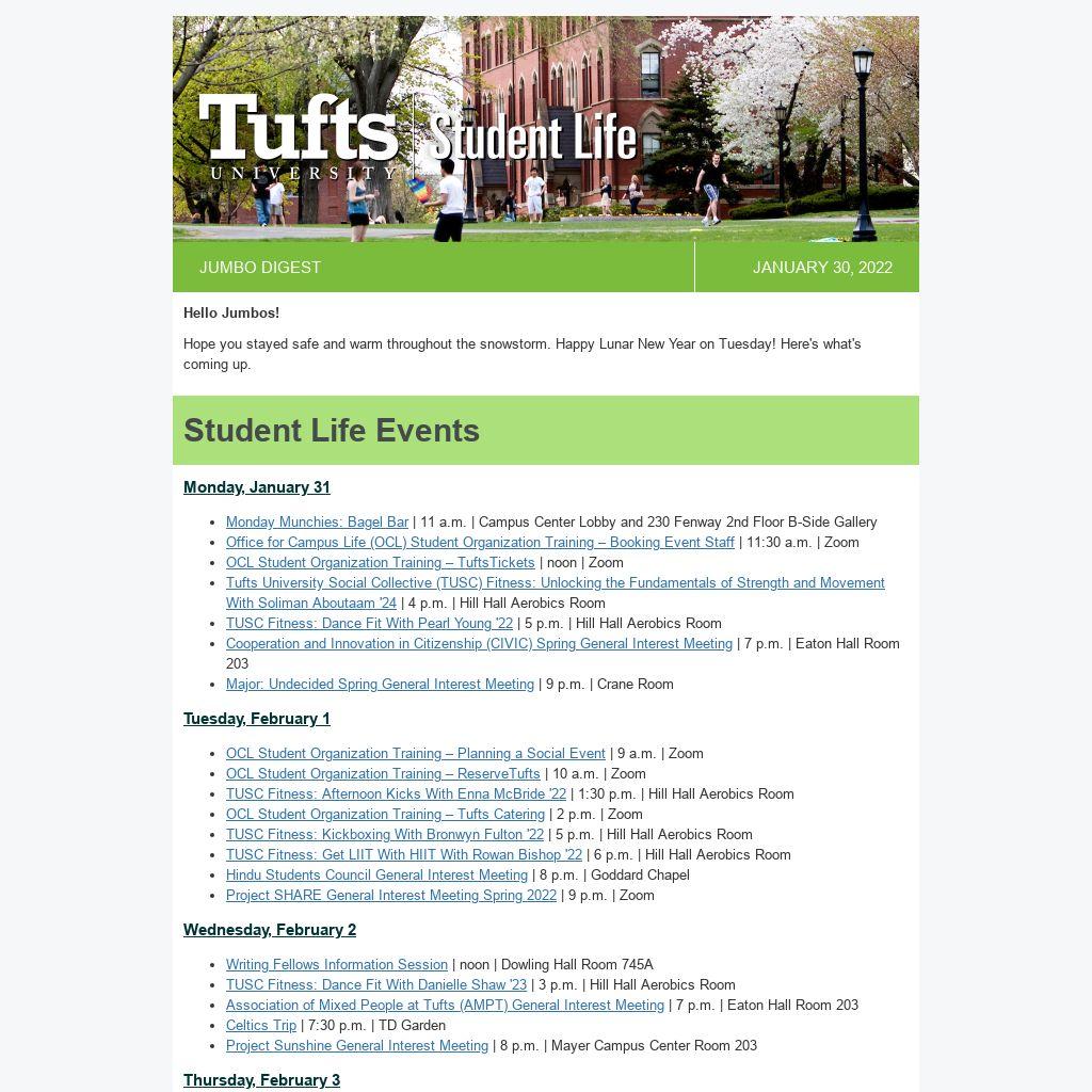 The Office of the Provost invites the entire Tufts community to host and attend events related to this year's Global Tufts Month theme: A Call to Action: Global Perspectives on Climate Change. These events will showcase Tufts' breadth and depth of global engagement and can range from lectures, film showings, cultural events, social programs, and more. Global Tufts Month is set for March 2022. Host your own event! Mini-grants up to $500 are available for event funding; submit by February 1.