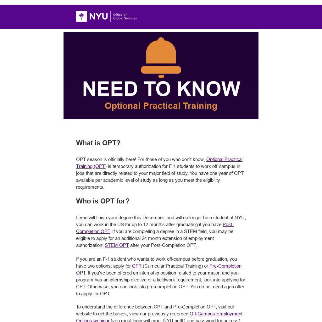 Optional Practical Training (OPT) is temporary authorization for F-1 students to work off-campus in jobs that are directly related to your major field of study. You have one year of OPT available per academic level of study as long as you meet the eligibility requirements.