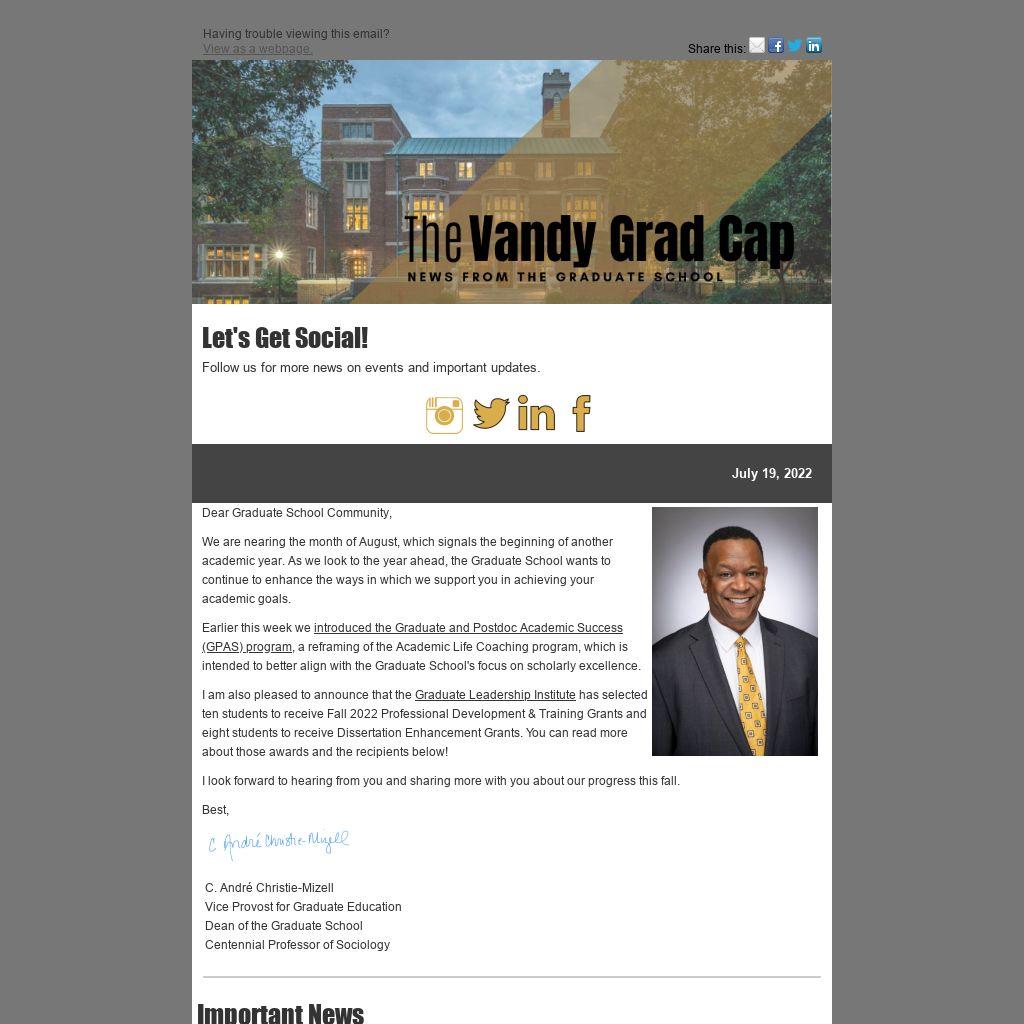 Newsletter SubmissionsTo submit content for this newsletter or to subscribe, please email all relevant information to gradschoolnews@vanderbilt.edu by the 11th day of each month. The newsletter will be published around the 17th day of each month.