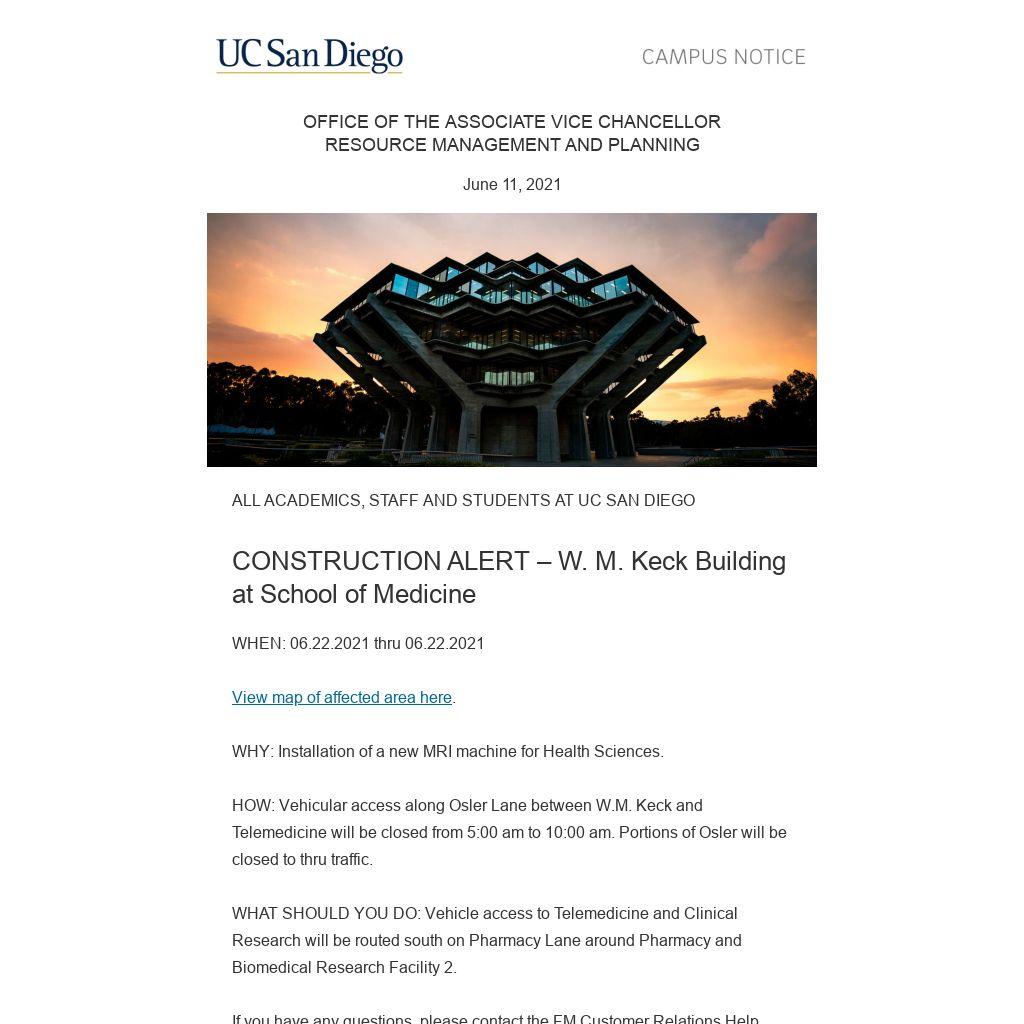 HOW: Vehicular access along Osler Lane between W.M. Keck and Telemedicine will be closed from 5:00 am to 10:00 am. Portions of Osler will be closed to thru traffic.