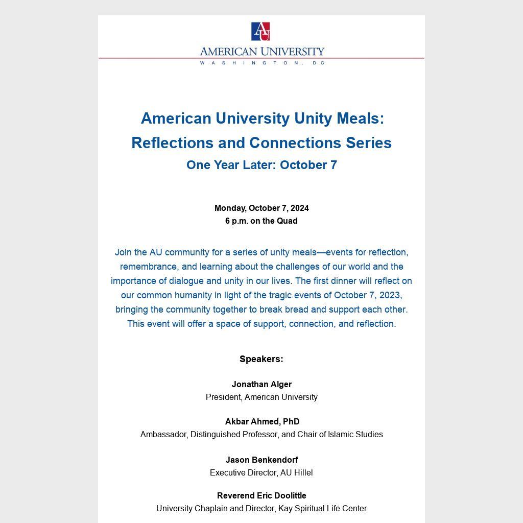 Join the AU community for a series of unity meals—events for reflection, remembrance, and learning about the challenges of our world and the importance of dialogue and unity in our lives. The first dinner will reflect on our common humanity in light of the tragic events of October 7, 2023, bringing the community together to break bread and support each other. This event will offer a space of support, connection, and reflection.