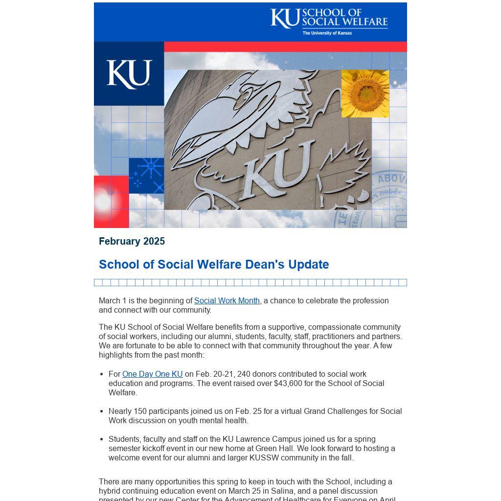 The KU School of Social Welfare benefits from a supportive, compassionate community of social workers, including our alumni, students, faculty, staff, practitioners and partners. We are fortunate to be able to connect with that community throughout the year. A few highlights from the past month: