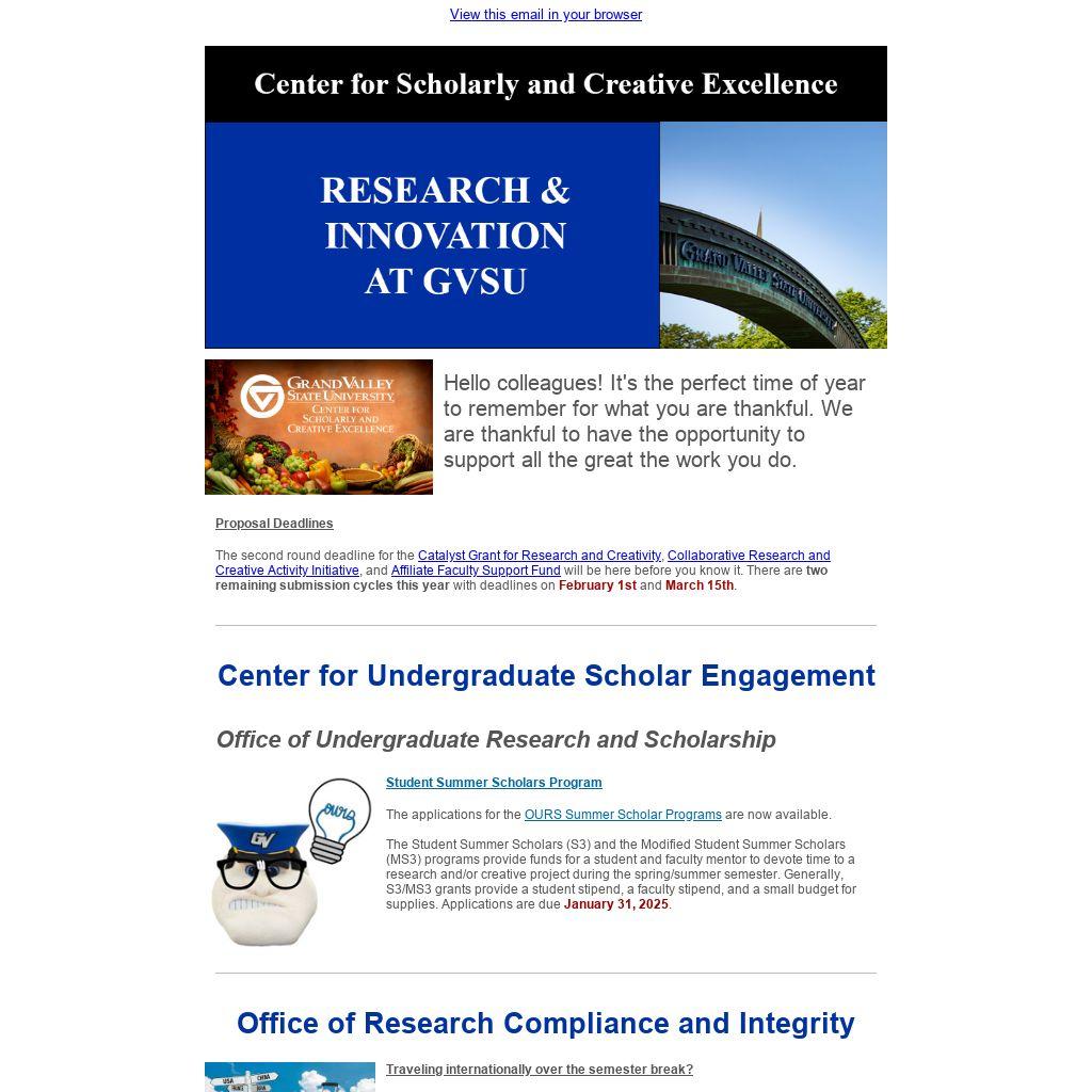 The Office of Sponsored Programs warmly invites you for an afternoon of camaraderie with fellow creative research enthusiasts! Whether you're new to GVSU and are looking for research support, or a seasoned grant recipient with wisdom to dispense, we would love to see you there. We'll be at the New Holland Brewery in Grand Rapids, Tuesday, November 12th, from 3:30-6:00pm! Space is limited and filling fast, so be sure to RSVP soon.