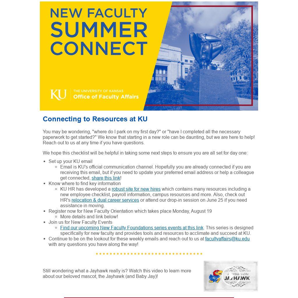 Continue to be on the lookout for these weekly emails and reach out to us at facultyaffairs@ku.edu with any questions you have along the way!