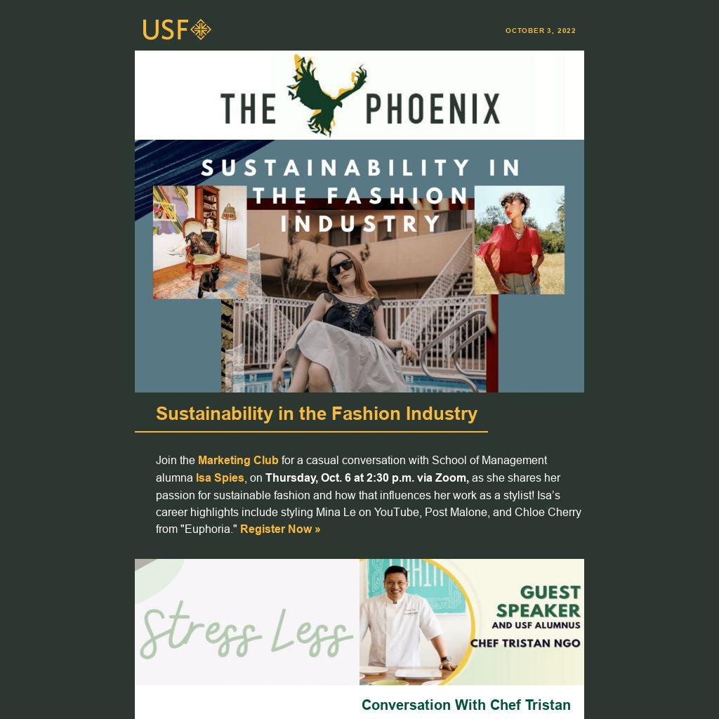 The Phoenix is a weekly e-newsletter sent by Student Leadership and Engagement to help students stay connected and get involved. It features campus events, leadership opportunities, athletic games, workshops, retreats, and more. Why “The Phoenix” title? The Phoenix has long been associated with the history and growth of USF as well as St. Ignatius, who encouraged followers to “go forth and set the world on fire.” Learn more »
